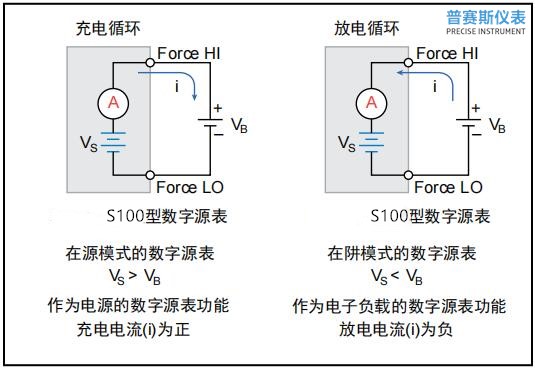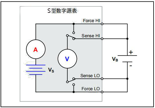 數字源表儀器的Force HI和Sense HI輸出端子與電池正極(+)端子相連,其Sense LO和Force LO輸出端子與電池負極(–)端子相連。