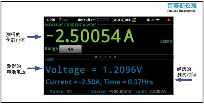除了通過總線監視讀數,在測試過程中,S型數字源表還能同時通過用戶界面,顯示負載電流、電池電壓以及經歷的測試時間。請看在S型儀器顯示屏上呈現的大字體、易讀測量結果